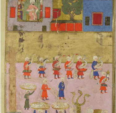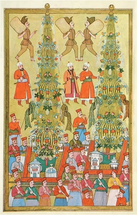 Görsellerini görmekte olduğunuz sağdaki ve aşağıdaki resimler Osmanlı'da farklı kutlamalardandır. İnsanların taşıdıkları, ağaç figürleri, tepsilerdeki hayvan motifleri gerçek ağaç ve hayvan değil, şekerden yapılmış heykellerdir.